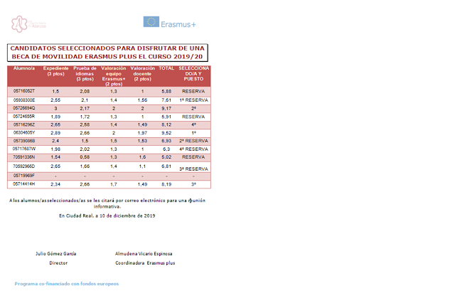 Ya tenemos a los candidatos/as seleccionados/as para irse a realizar sus prácticas con una beca Erasmus plus, de marzo a junio de 2020!