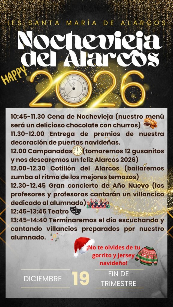 El IES Santa María de Alarcos presenta el Cartel de actividades navideñas para el próximo viernes 19 de diciembre de 2025. Este día estará marcado por un programa festivo para cerrar el trimestre, con el inicio de las actividades a partir de la tercera hora, en el que habrá actividades navideñas, mientras que en la primera y segunda hora se mantendrán las clases normales.