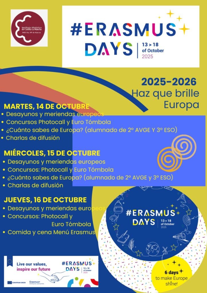 Del 13 al 18 de octubre de 2025, en IES Alarcos nos unimos a la celebración mundial de los Erasmus Days 2025, una iniciativa que pone en valor la importancia de la movilidad, la cooperación y la cultura europea en la educación.