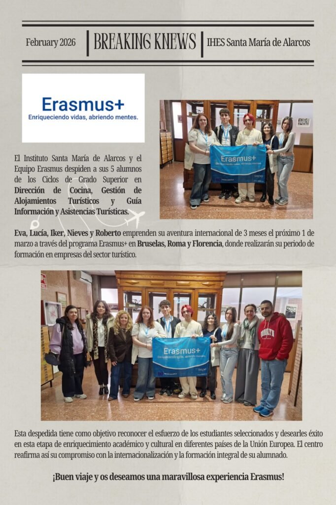 El Instituto Santa María de Alarcos, junto con su Equipo Erasmus, despide a cinco alumnos de los Ciclos de Grado Superior en Dirección de Cocina, Gestión de Alojamientos Turísticos y Guía Información y Asistencias Turísticas, que emprenden una experiencia internacional de tres meses a través del programa Erasmus+. A partir del 1 de marzo, Eva, Lucía, Iker, Nieves y Roberto realizarán su periodo de formación en empresas del sector turístico en Bruselas, Roma y Florencia.