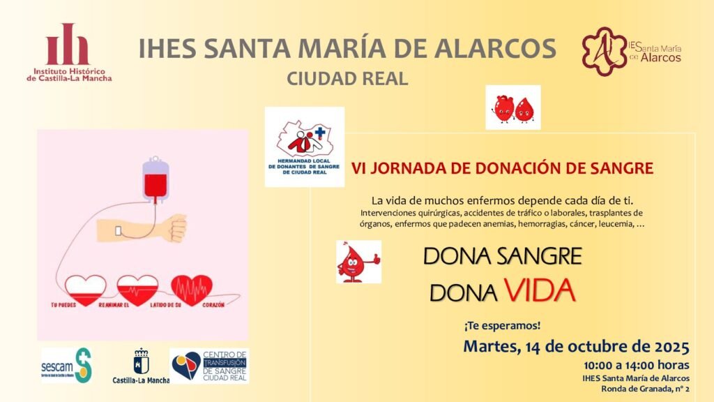 El próximo martes 14 de octubre, el Instituto de Educación Secundaria Santa María de Alarcos acogerá la VI Jornada de Donación de Sangre, una iniciativa solidaria que busca concienciar a la comunidad educativa y a la ciudadanía en general sobre la importancia de donar sangre para salvar vidas.